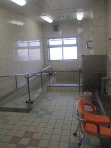 清潔で明るいスロープ付きのバリアフリー設計。脱衣室カウンターは車椅子対応です。