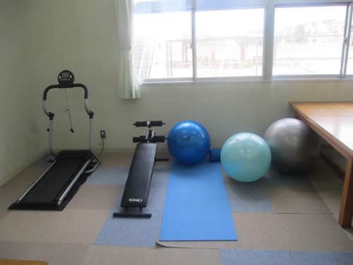 広く明るい作業場です。ウォーキングやバランスボールでトレーニングを行う事が出来ます。